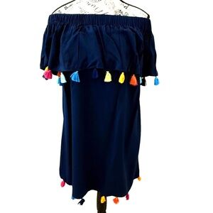 Escapada Living Off-the-Shoulder Rayon Dress with Tassels; Blue; Women's Large