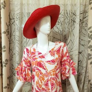Adorable resort style tunic top with vibrant print and double-tiered ruffles along the sleeve.
