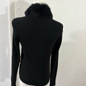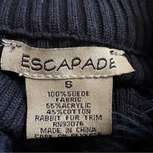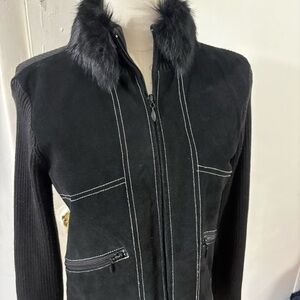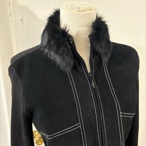 Escapade Suede Zip Jacket Sweater Contrast Stitch Rabbit Fur Collar Black Sz S