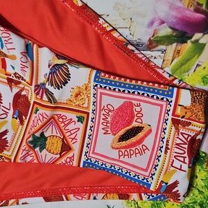 Colorful bikini bottom with a unique stamp design. Features a mix of red and multicolor patterns.