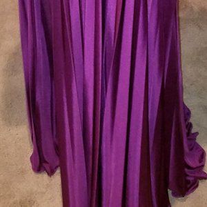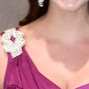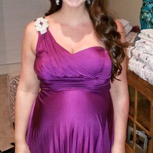 Beautiful deep, eggplant purple one shoulder, rhinestone embellishment, pleated, Empire waist dress worn once. This pleated dress flows beautifully as you walk. Sleek on top, flirty on the bottom. XSCAPE balances two chic looks in one on this charming fit & flare dress. The eggplant color exudes elegance.