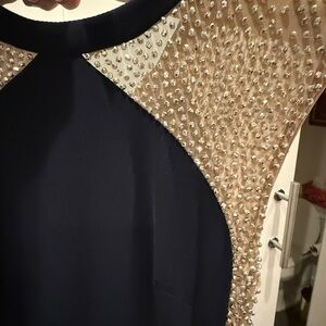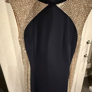 Escape formal dress with sheer beaded sides and sleeves. Size 8 navy