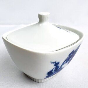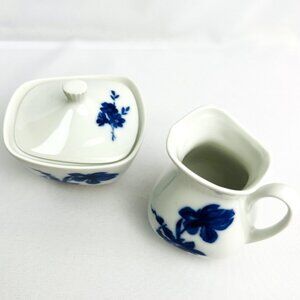 Elegant set of Bavarian sugar and creamer featuring a delicate blue floral design on a crisp white porcelain base. The sugar bowl is an abstract square shape includes a matching lid with a charming knob. Each piece is marked "Eschenbach Bavaria" and crafted in Germany, renowned for its fine porcelain.