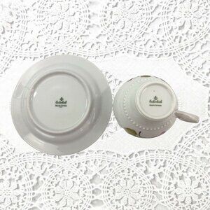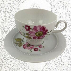 Eschenbach China Tea Cup & Saucer set is a Bavarian, German product, with a white base and pink flower design, finished with a beaded trim.
