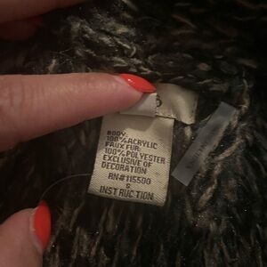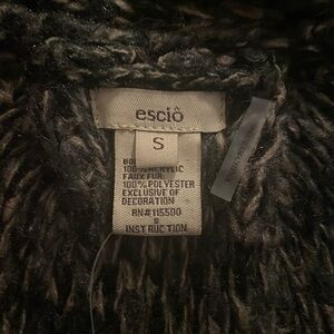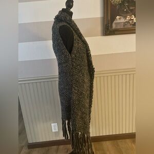 Stylish long knit vest by Escio in excellent condition. Features a cozy open-front design, soft textured knit in black, gray, and brown tones, plus chic fringe detailing along the hem. Perfect layering piece for adding warmth and style to any outfit. Size Small.
