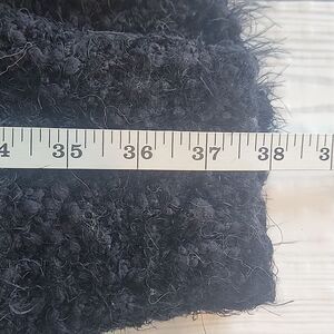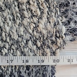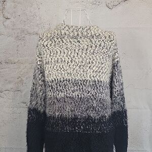 A beautiful long silhouette sweater by Escio in an ombre of white to black eyelash knit fabric, long sleeves, and an optional one button closure at the neckline. Great pre-owned condition.