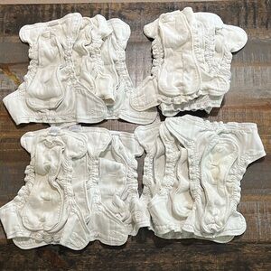 Esembly cloth inner liner lot. 13 cloth liners total. All are size 1. A mix of relaxed / regular elastics but both worked well as long as the outer liner was on correctly. They are in good condition. I always used esembly detergent and followed their cleaning directions. Most have no to very minimal staining. One has mild staining which improved with sunning (see last photo).