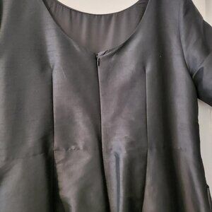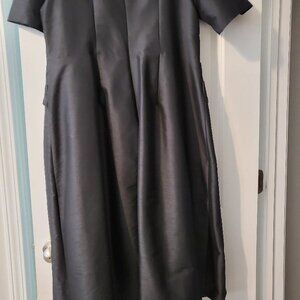 Eshakti's poly-dupioni dress styled with attached wide asymmetric tie that culminate in a waist spanning bow for a feminine accent. Item has a boat neck, elbow sleeves, back zip and hook-eye-closure. Has inner shoulder bra straps. Dress has a flared bottom skirt, and comes with side slant front pockets. *Item worn once. Excellent condition!!!! Smoke-free and pet free environment.