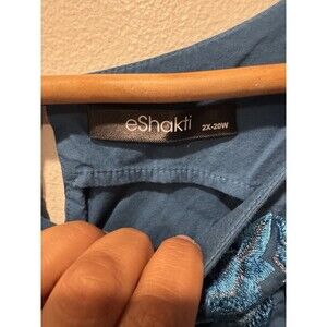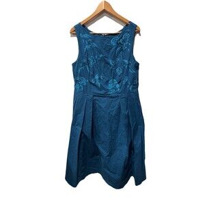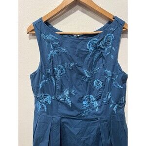 The Eshakti Dark Teal Floral Embroidered Poplin Over the Knee Cotton Dress in size 2X is a versatile and stylish piece perfect for various occasions. This sleeveless dress features a beautiful floral pattern with embroidered accents, adding a touch of flair to the fit and flare silhouette. The dress has a zip closure, making it easy to put on and take off. Made from a blend of spandex and cotton, the dress is comfortable and machine washable. With its knee-length design and drop waist, this dress is ideal for summer and spring events, whether it's a wedding, party, or casual outing.