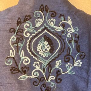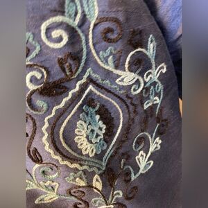 This elegant blue evening coat w/ pockets!! features intricate embroidery, adds a touch of sophistication to any ensemble. Has wider sleeves. Embroidery is a range of blues and black. On sleeves as well. Unique piece. And pockets. Open style no fastenings. Never worn no flaws. Fully lined. Pit to pit almost closed is 24” shoulder to hem 34”. Formal, evening, wedding, elegant.