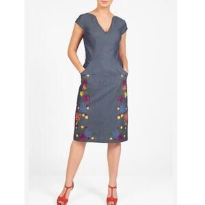 Eshakti Floral Embroidered Boho Chambray Denim 100% Cotton Sheath Midi Dress
