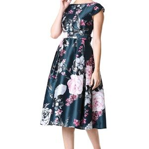 Our floral print polydupioni dress with overblow roses is cinched in with an elasticated self-belt and a wide bow at the back. The princess-seamed bodice and pleated skirt are classically flattering, while pockets and a midi-length hemline offer modern elements.