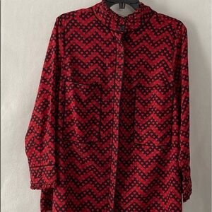 Eshakti Size 1x Chevron Red Heart Print Crepe Ruffle Black Trim Shirt. Preowned item in good condition with minimal wear.