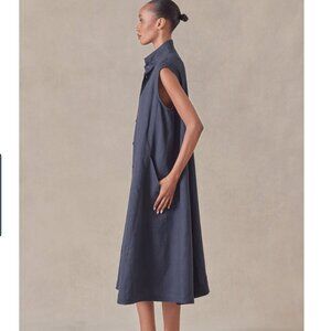 Eskandar teal blue linen sleeveless button up midi shirt dress with notch collar and side pockets. Lightweight 100% Linen. Full trapeze shape. Excellent condition, no flaws or wear. Very similar to stock photos but not the same style.