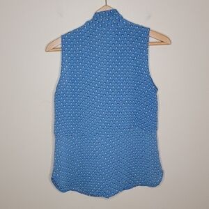 Blue button front sleeveless tank blouse with a yellow & blue print. Attached secretary style tie neck.