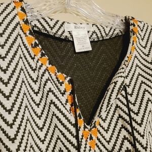 Women's chevron and aztec printed blouse with tassels from Easley, size medium. V-neck collar with small splits on the sides and elastic wrists. 3/4 length sleeves. Excellent pre-owned condition; no flaws.