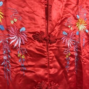 Brand new. Has been folded up so a little wrinkled. It doesn’t fit me. It’s beautiful though. Silk and rayon. Size M.