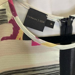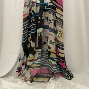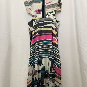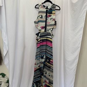 Espaco Fashion stunning full length dress, pink black yellow blue abstract, cut outs at sides, mesh detail on chest and hem, beautiful bold fun elegant, perfect stand out dress for formal cocktail night out evening bachelorette party, size M