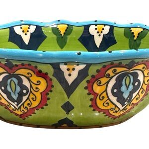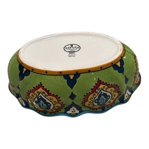 Bright colored designs on hand-crafted earthenware make this oval serving bowl from Espana a fun way to serve a variety of dishes at your next gathering with friends and family.
