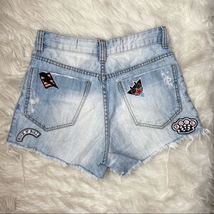 These shorts are begging to be worn to your favorite rock band concert! These are perfectly distressed and have rock and roll themed patches all over. They are high rise so these will fit at the smallest part of your waist. Inseam measurements are approximately 11”