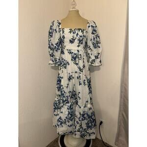 Especia White Floral Tiered Smocked Square Neck Boho Cotton Dress Size Medium