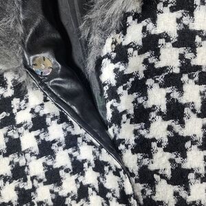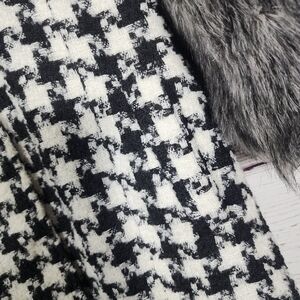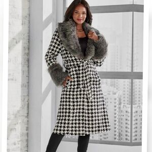 Stylish black and white houndstooth print coat featuring luxurious grey faux fur trim on the collar and cuffs. Perfect for a sophisticated look.