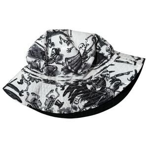 DESCRIPTION: Promotional bucket hat features a black and white reversible design. On one side, the hat is black with an embroidered Espolon Tequila logo at the front. On the other side, the hat displays an allover black & white skeleton scene and pink branded logo tag.