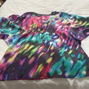 Silk multi-color dress perfect for spring/summer. For a person 5'3" tall, it fits right below knees. Dry Clean Only.