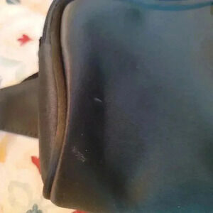 This Esprit convertible crossbody belt bag in dark green is perfect for travel or casual occasions. With a rectangular shape and zip-around closure, this small bag has a width of 7 inches, a height of 5 inches, and a depth of 3 inches. The bag features a black cat character and is made of a lightweight polyester and nylon exterior material with a solid pattern.
