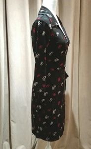 V-neck, collar, adjustable tie at waist, very good condition, predominantly black with a circle design of red, green, blue and white
