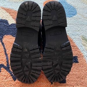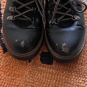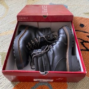 As the title indicates, here is a pair of beat-up, black, Erica Boots, by Esprit. I bought them at Marshall's in 2015 to use in icy weather, because the traction looked really good, and it was! They weren't particularly warm, however, and in light of the photos you'll see, not that well-made either, as I never wore them THAT much. So you can see they have peeled, probably from using rock salt when shoveling a lot. But the other, more egregious issue, shown in photos 11-12, is that the sole of the right boot is cracked, beginning at the side, and running all the way to the other side, so you'd probably not want to wear them in rainy or muddy conditions. I wasn't aware of it until listing them, because you don't feel it in the footbed when it's on, it's still pretty solid in feel. So these could work for you if you're going for a punk-rock, combat-boot look. Photos show all angles, laces are extra long & you can actually wrap them all the way around the ankles & still tie them with lace to spare. Heel height shown in photo 13, a solid 1.5" but below you'll see Zulily's description that says they're are 1.75". Photo 10 shows inside tag w/more info. Come in original box, as shown.