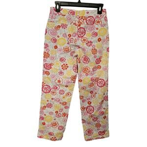 Esprit Red, Yellow, Pink, White, & Gray Floral Stretch Ankle Jeans with no back pockets. artsy, 60's style, boho, floral, art to wear, groovy, summer, vacation, resort, cruise, tropical, casual.