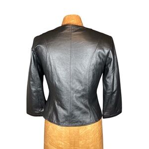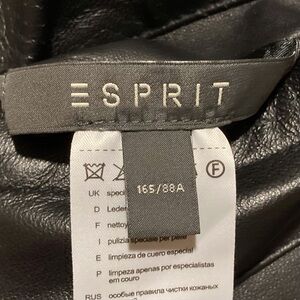 Unique fully reversible jacket with super soft lamb leather on one side and classic wool blend tweed on the other. Full zip on both sides; pockets on leather side only. 3/4 sleeves. Perforated leather details. Esprit black label.