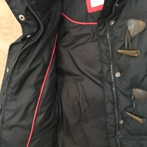 Navy blue. EUC! Zip pockets on each side. Zip closure with a placket to cover and toggle buttons. Awesome fabric high neck. Feather filled. Warm. Soft. Good quality. Hits below waist. WARM!