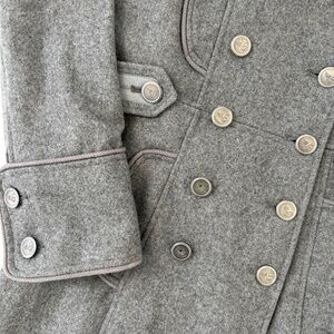 Keywords: Esprit coat, gray wool coat, double breasted trench, military style jacket, vintage Esprit outerwear, longline tailored coat