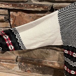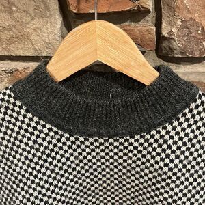 Esprit wool-blend mixed pattern sweater. Ribbed collar and hems. Black and white checkered pattern on upper portion. Slightly puffed sleeves. Red, white, and black lower portion. Gently used preowned condition, see photos.