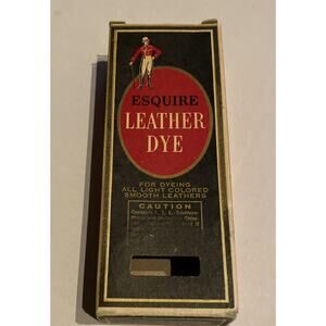 Vintage Esquire Brown Leather Dye Semi Full Bottle and Box. 1940 - 1950 (?). The bottle does still have liquid but I cannot guarantee that the contents are still good. Box is in overall good shape but does have some letters wearing off. See pictures for specifics. The date is an assumption.