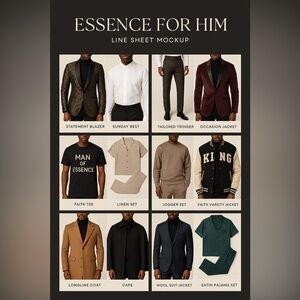 Essence for Him by Passion of Essence Boutique offers bold, refined menswear crafted for the modern gentleman of faith, style, and substance. Discover statement blazers, Sunday sets, luxe loungewear, and gift-worthy pieces designed to elevate every occasion—from the pulpit to the photo shoot.