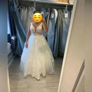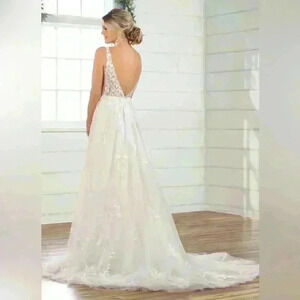 All-natural, bohemian inspiration with a touch of refined glamour—wedding dress Style D3023 from Essense of Australia is a dream come true for your inner boho goddess. Organic shapes feature distinct leaf shapes as opposed to traditional floral detailing for a uniquely modern update, as they gently cascade over the sheer bodice with plunging neckline. Falling at varying lengths over the natural waistline and onto the skirt of layered glitter tulle and Regency organza, these details truly shine throughout this whimsical yet elevated design. A clean V-back detail is created with sheer panels covered in leaf detailing for a head-turning statement, while the back of the skirt flows out into a lush, frothy train.