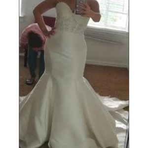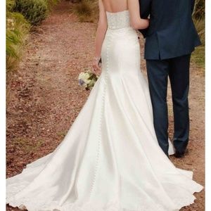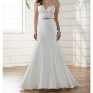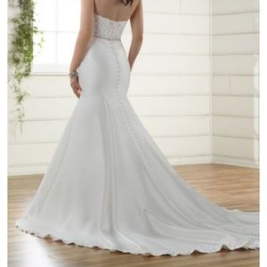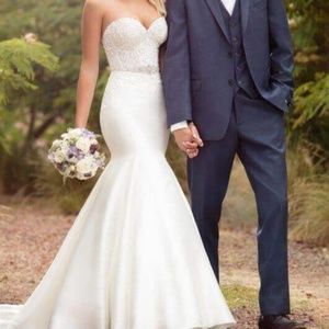 A stunning style from Essense of Australia, this classic trumpet wedding dress is like a romantic dream! A sheer, embroidered bodice – accented perfectly with a sweetheart neckline – sets the stage for romance. The lace detailing of the bodice on this trumpet wedding gown extends slightly through the hips, helping to elongate the body and show off your silhouette. Dress has minor dust marks under the dress which can be easily wiped off. Dress altered to fit a street size 2.