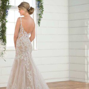A completely bespoke design, this layered lace wedding dress with plunging V-neckline from Essense of Australia is oh-so dreamy. A high neckline with an organic-lace finish perfectly complements the plunging V-neckline of this bodice. Layers of cotton-style lace and French lace come together to create a soft, unique look that continues through the bodice and onto the skirt. Sheer cutouts adorn the sides of the gown, and extend into an open back. Bugle beadwork is placed throughout the gown to help create dimension. Large, lace motifs adorn the back of the skirt, which extends into a long, frothy train. The back of this layered lace wedding dress zips up beneath pearl buttons.
