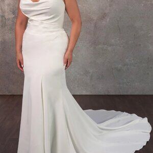 Style D4193 features a gorgeously draped strapless bodice with a soft sweetheart neckline, the luxe satin fabric wrapping to the back where a gown-length row of fabric-covered buttons adds a classic touch to this contemporary bridal look. Fitted contour seamwork outlines the sleek fit-and-flare silhouette, evolving into a trumpet skirt just above the knee.
