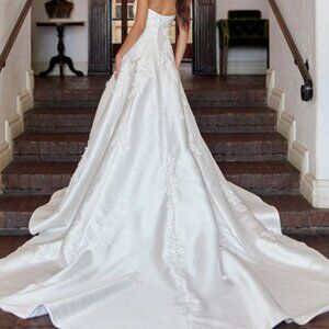 Style D4195 features a straight-across asymmetrical strapless neckline gracefully draped in chic Mikado fabric, showcasing its lustrous sheen. Romantic 3D floral lace appliques are intricately placed throughout the bodice and entire gown for a tasteful and luxurious bridal look. The classic A-line dropped waist silhouette gracefully flows from bodice to skirt, creating a seamless and timeless look as fabric-covered buttons run the full length of the back of the gown, meeting the edge of the lace-detailed train.