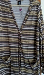Agnes&Dora Essential Cardigan. Striped pattern in shades of grey, lavender, white and yellow. Button up, front pockets.