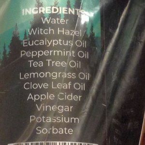 New Natural odor eliminator. Freshen up shoe and closet areas. Spritz near clothes but not on them. Contains Eucalyptus, Teatree Oil, Lemongrass and Clove essential oils plus other odor eliminating ingredients. 4 ounces. This has a strong scent so a little goes a long way. I spritz above my carpet with this as well, freshens.