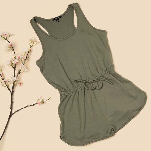 - A scoop neck, sleeveless racerback romper in a French terry knit fabrication featuring dolphin-hemmed shorts