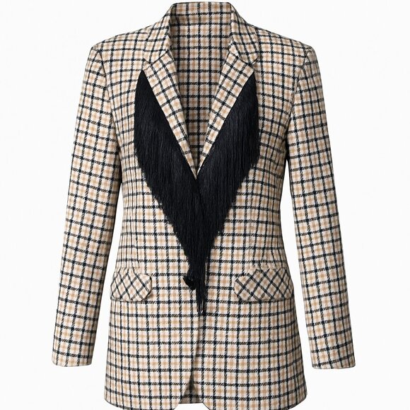 Instantly elevate any look. This Essential Tailored blue, white, and tan plaid blazer features a sleek, single-breasted design with black fringes and a flattering, structured fit. It's fully lined and perfect for transitioning seamlessly from the office to evening wear. Your go-to piece for instant polish.