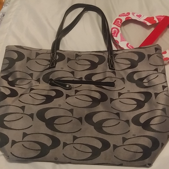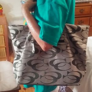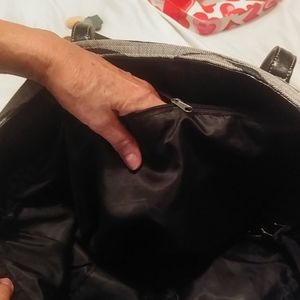 18 x 13 x 6.5 inch silver and black with black lining. Interior features include 2 drop pockets on one side and 1 zipper pocket on the other. Does have some scuff marks and wear. Please see photos. Feel free to make me an offer!