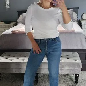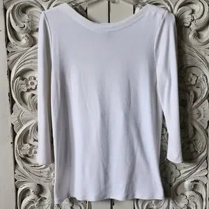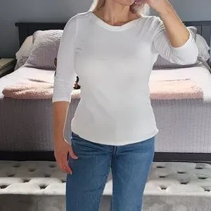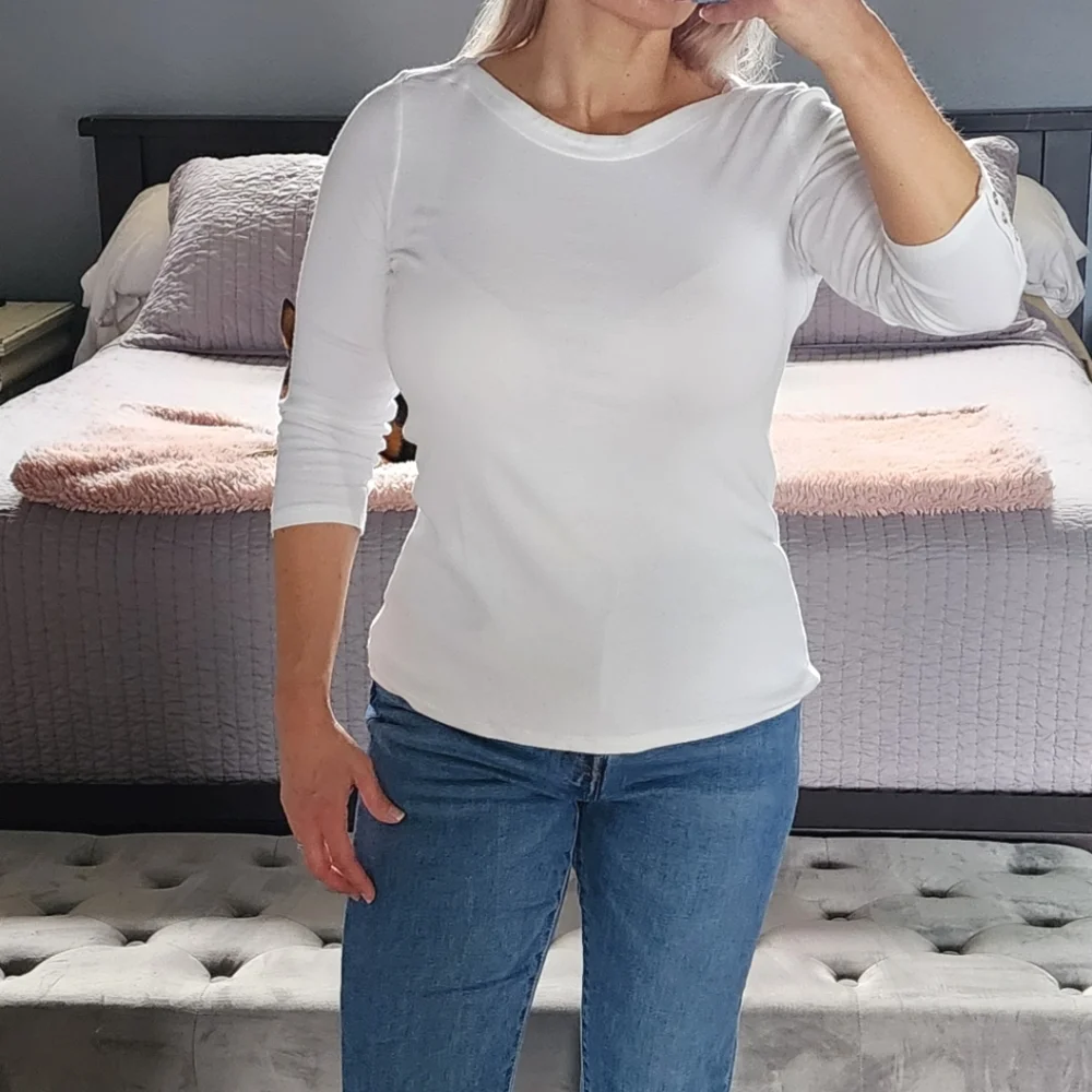 Boat neck with 3/4 length long sleeves. Button detail on sleeves. Full length, hits at hip. Easily tuck or wear out. Perfect basic for your wardrobe. Great layering piece to wear year round. Super soft Pima cotton!