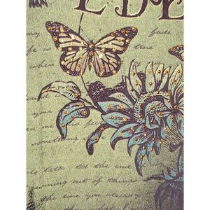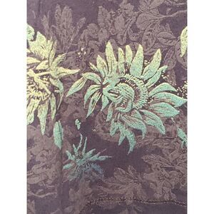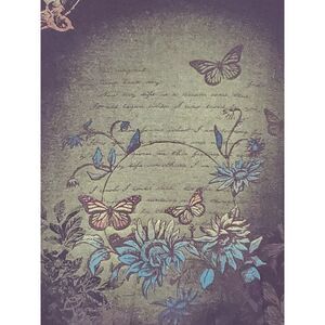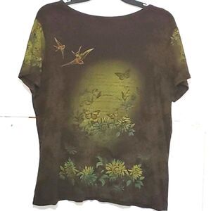 This shirt is very pretty and very aesthetically pleasing. It has a variegated green color with gold tone metal studs along with birds, butterflies, and plants. It is printed on front and back. This piece is in very nice pre-owned condition. It is a pullover style t-shirt with short sleeves and it is 100% cotton.